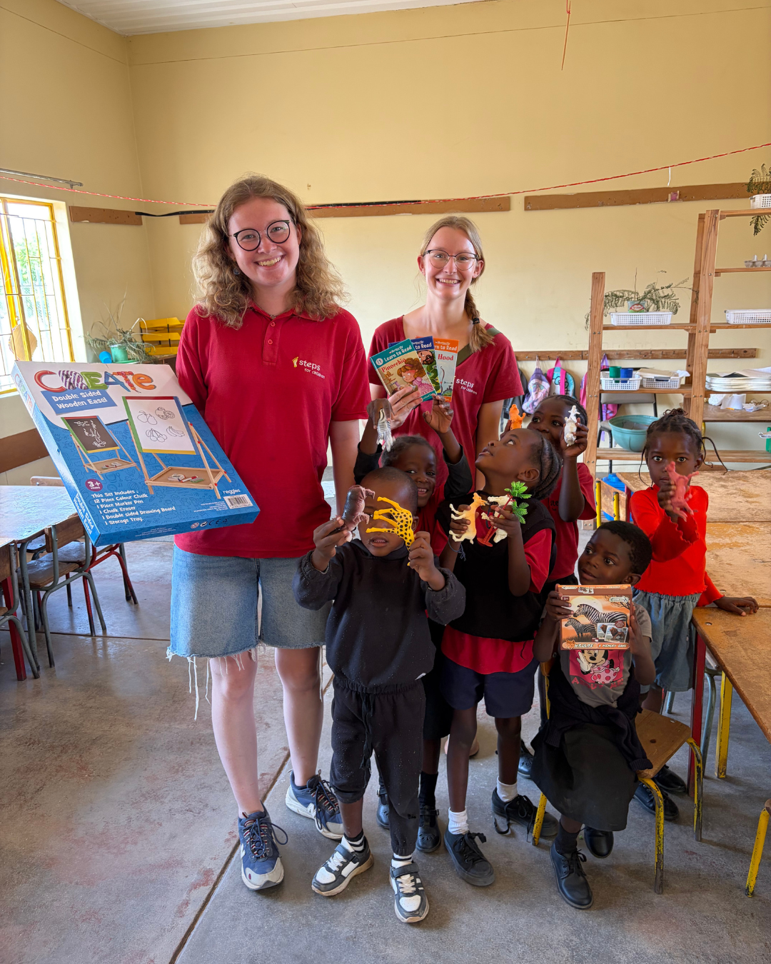 Zwei von den vieren sind bis Mitte des Jahres in Okakarara, eine ist bereits wieder unterwegs und Antonia ist seit Beginn des Jahres bei steps in Gobabis. Auch hier hat sie den Kindern Holzspielzeuge mitgebracht.