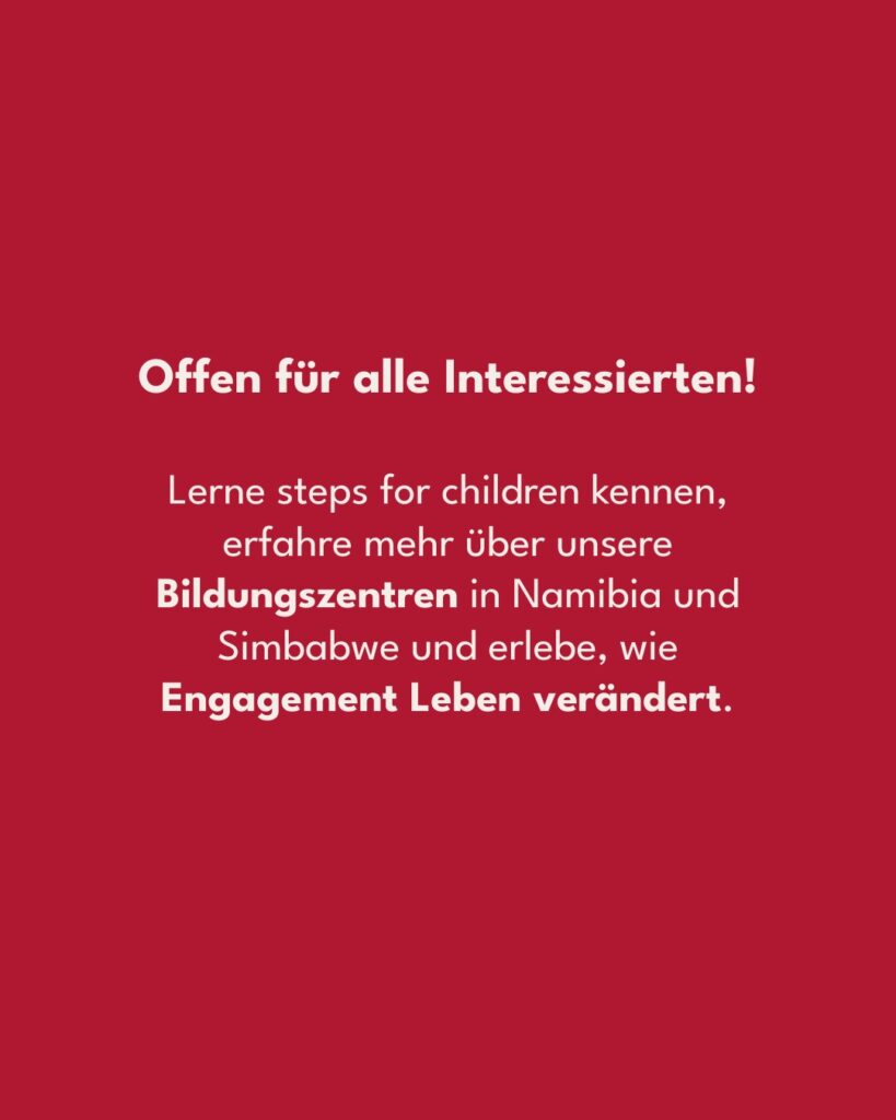 Die Veranstaltung ist offen für alle Gäste & Interessierte! Dies ist eine wunderbare Gelegenheit, unsere Arbeit kennenzulernen und mehr über die Wirkung unserer Projekte in Namibia und Simbabwe zu erfahren.